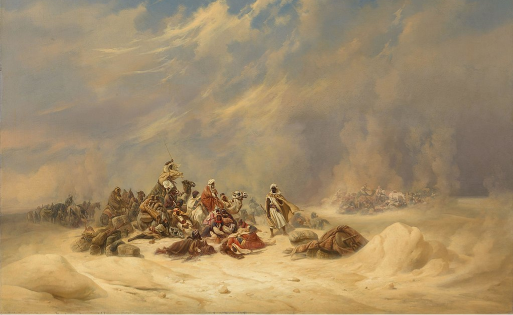 Niels Simonson - Een karavaan overvallen door een storm in de woestijn, 1855 (cropped). Zelfs hier zijn kameelachtigen op gebouwd. Bron: Wikimedia Commons / National Museum of Art, Architecture and Design (Noorwegen)