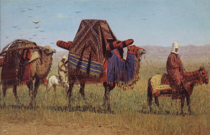 Vasily Vereshchagin - Migratie van de Kirgiezen, 1869/70 (cropped). Karavanen in de stijl van steppenvolkeren of China zagen er anders uit dan die in Arabische en Afrikaanse woestijngebieden. Dat was altijd al zo en lag niet alleen aan de verschillende diersoorten. Bron: Wikmedia Commons / Tretyakov Gallery (Moskou)