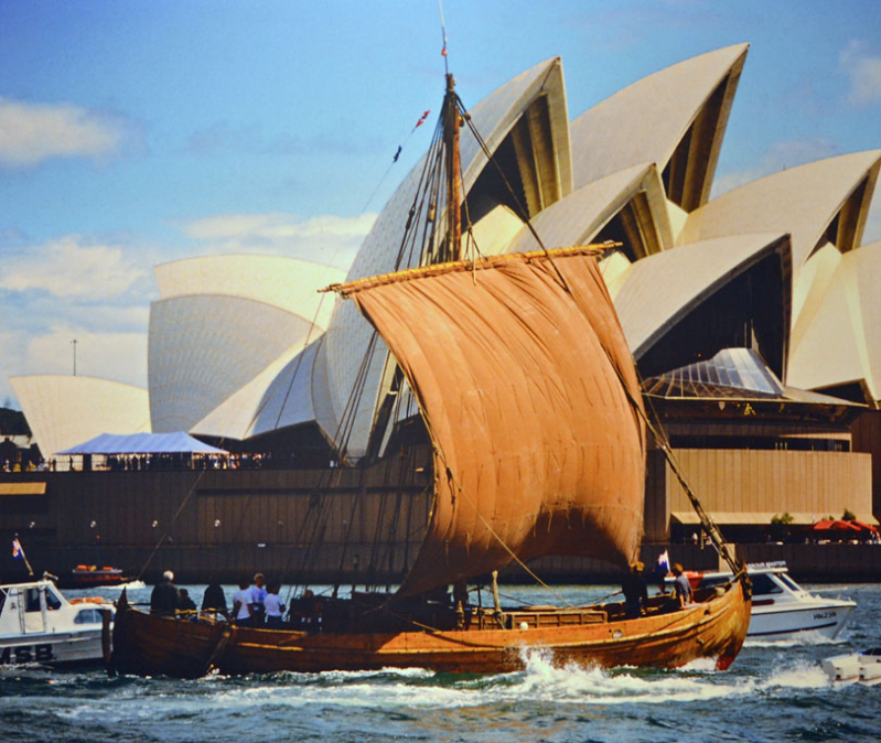 Islandmen - De Saga Siglar, een replica van een knarr, vaart voor de opera van Sidney langs, 2014. Bron: Wikimedia Commons