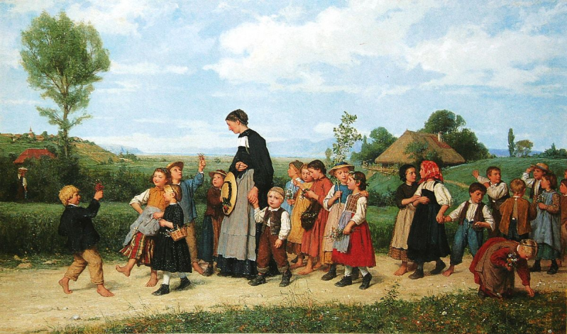 Albert Anker - De schoolwandeling, 1872. In Duitstalige landen had men in de 18de eeuw nog geen gymlessen, maar de regelmatige schoolwandeling stond waarschijnlijk al sinds Basedow en Pestalozzi bij veel scholen op het programma en zou er lange tijd als normaal blijven gelden. In andere landen kwamen ze veel minder voor of helemaal niet. Bron: Wikimedia Commons