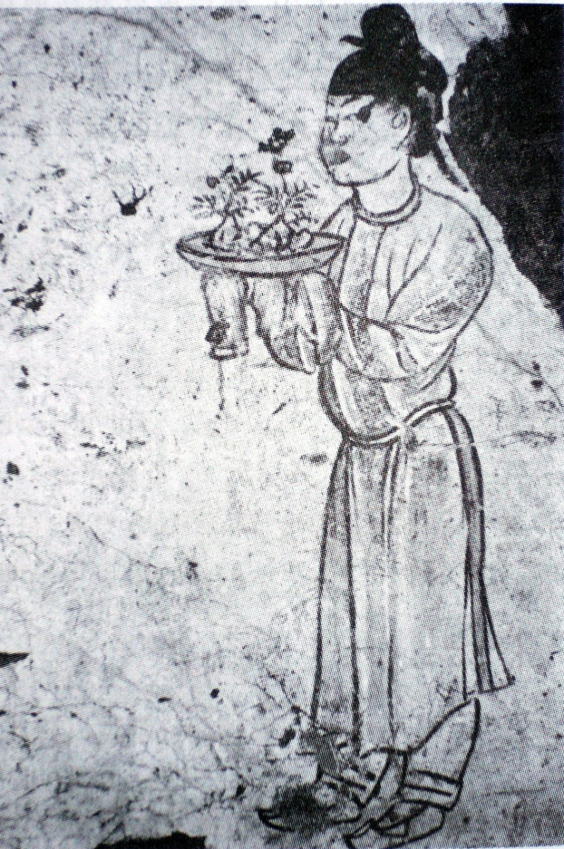 De oudst bekende afbeelding van penzai op een muurschildering in het Qianling-mausoleum waar heersers uit de Tangdynastie van het huis Li zijn begraven, 706. Bron: Wikimedia Commons